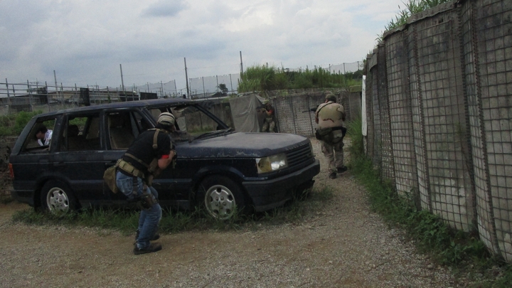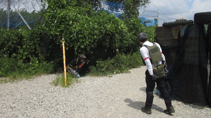 車バリケードから前方へ進攻するウラノ隊員をフォローするカテイ隊員